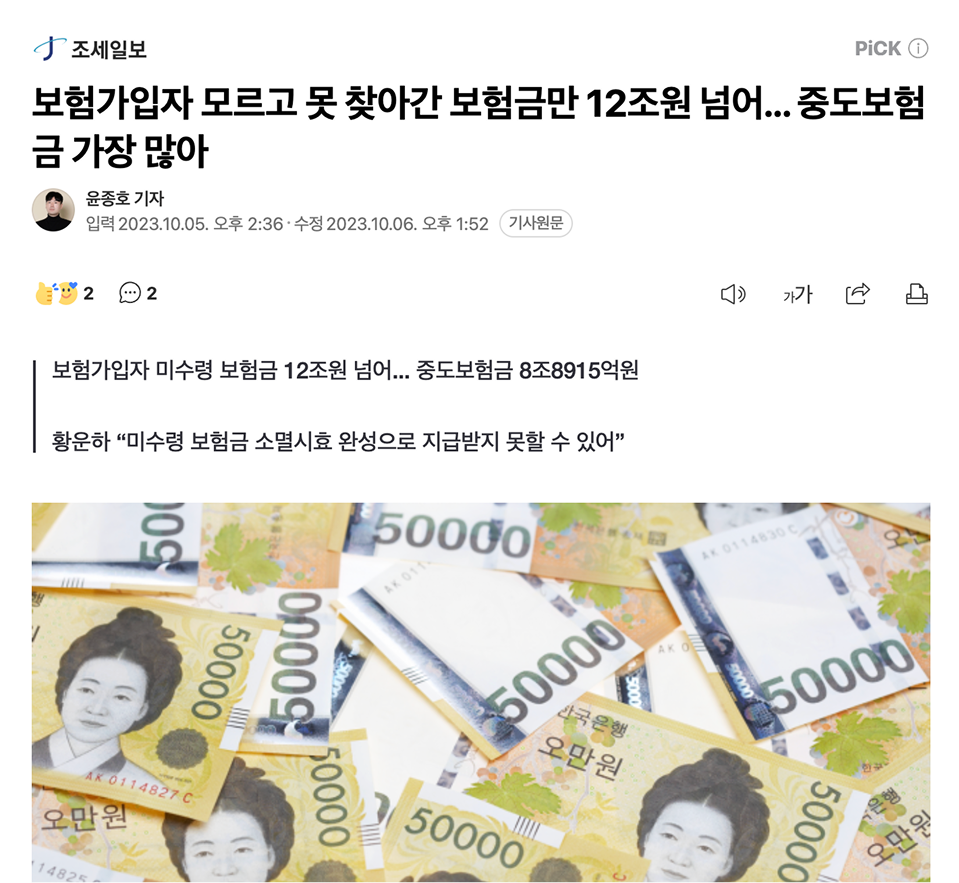 가입해놓고 찾아가지 않은 이수의 보험금은